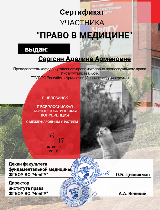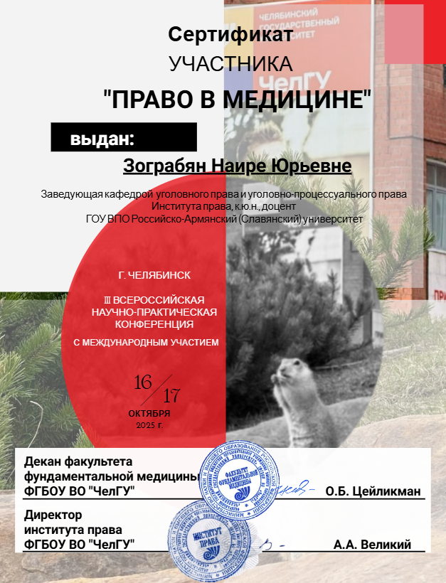 Третий год подряд заведующая кафедрой уголовного права и уголовно-процессуального права, к.ю.н., доцент Зограбян Наира Юрьевна и преподаватель кафедры уголовного права и уголовно-процессуального права, к.ю.н. Саргсян Аделина Арменовна приняли участие в III Всероссийской конференции с международным участием «Право в медицине», организованной Институтом права Челябинского государственного университета.